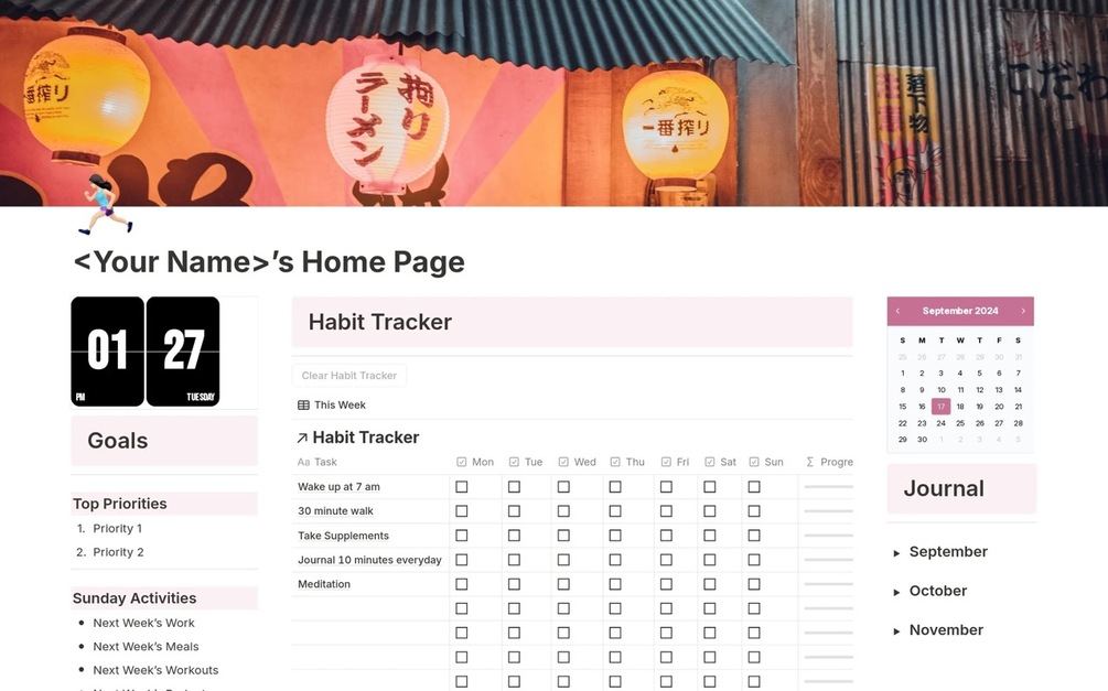 The only Home Page you need, and it is fully customisable. You can see your entire life on this Notion Home Page - from tracking your habits, planning your weekly meals, workouts, budget and work tasks. I have used this for planning my life every week for the last 2 years.